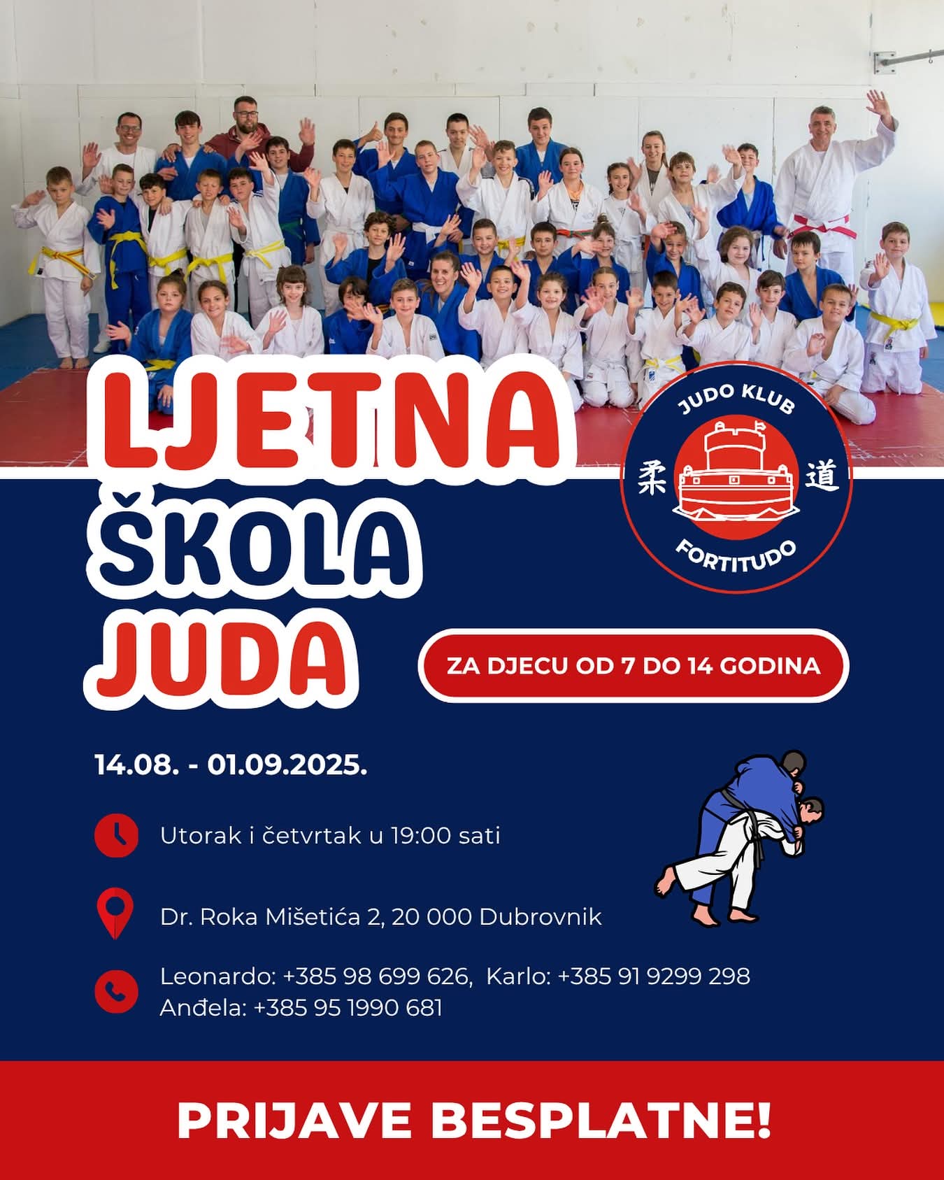 Od 14.08. do 01.09.2025. Judo klub “Fortitudo” poziva svu djecu od 7 do 14 godina da im se pridruže na besplatnim treninzima u sklopu Ljetne škole Juda i provedu kraj ljeta aktivno, zabavno i sportski!
