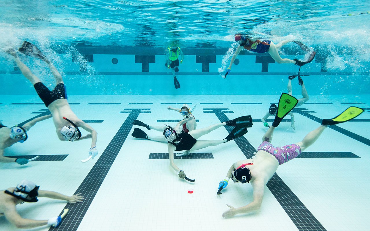 Zamislite ovo, bazen s golovima na obje strane, plastikom obložen olovni pak na dnu, dvije ekipe od 6 igrača u vodi s 4 igrača van bazena kao zamjenom. Igrači nose maske, disalice, peraje i palice. Igrači udahnu, zarone i pokušavaju utjerati pak u protivnički gol.