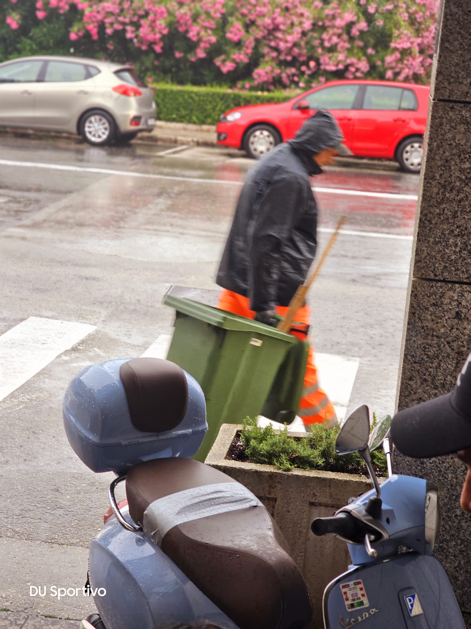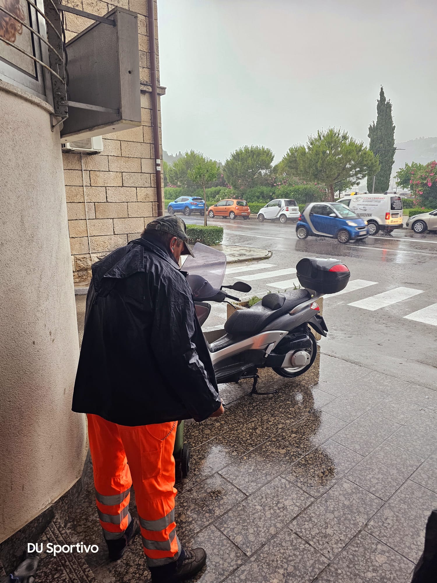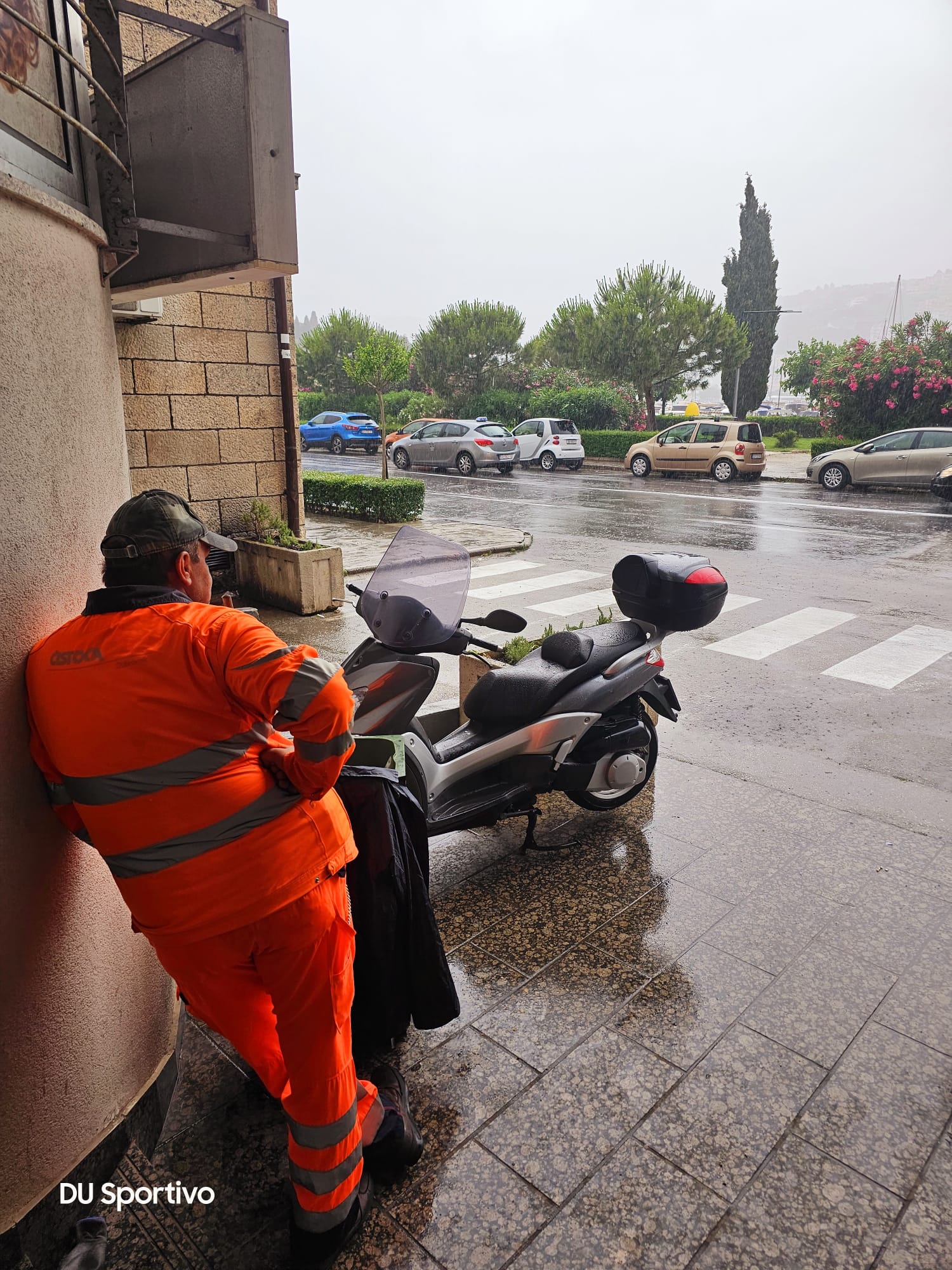 DU Sportivo sklonio se od uistinu velikog pljuska (kasno op.a.). Skupa s djelatnikom Čistoće i dvoje turista. U jednom trenutku gospar je ponudio turistima pomoć, pa im je uljudno otvorio da mogu ubaciti otpad. Sklonio se na pet minuta da uhvati zraka i kao što slika pokazuje po pljusku vrijedno, pošteno, savjesno a i nadljudski po nevremenu nastavio s poslom.