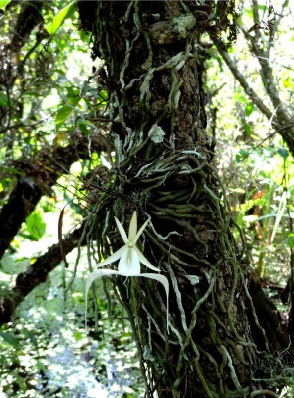 Fantomska orhideja ili Duh orhideja i rijetko viđeni bijeli cvjetovi koji lebde iznad kore drveća bez listova, fotosintetizirajući svojim korijenjem!